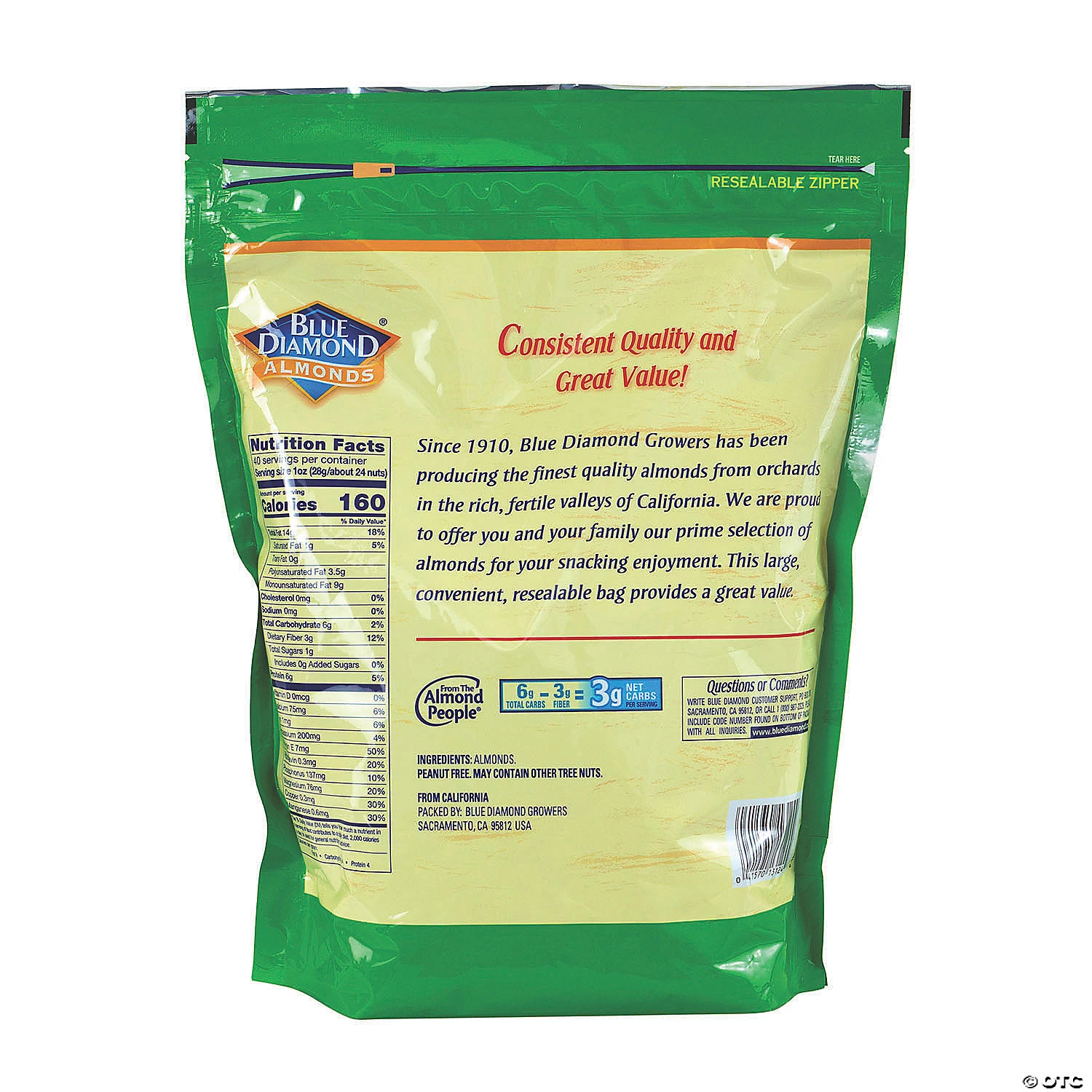 Since 1910, Blue Diamond Growers has been producing the finest quality almonds from orchards in the rich, fertile valleys of California. They’re proud to offer you and your family their prime selection of almonds for your snacking enjoyment. This large, convenient, resealable bag provides a great value.