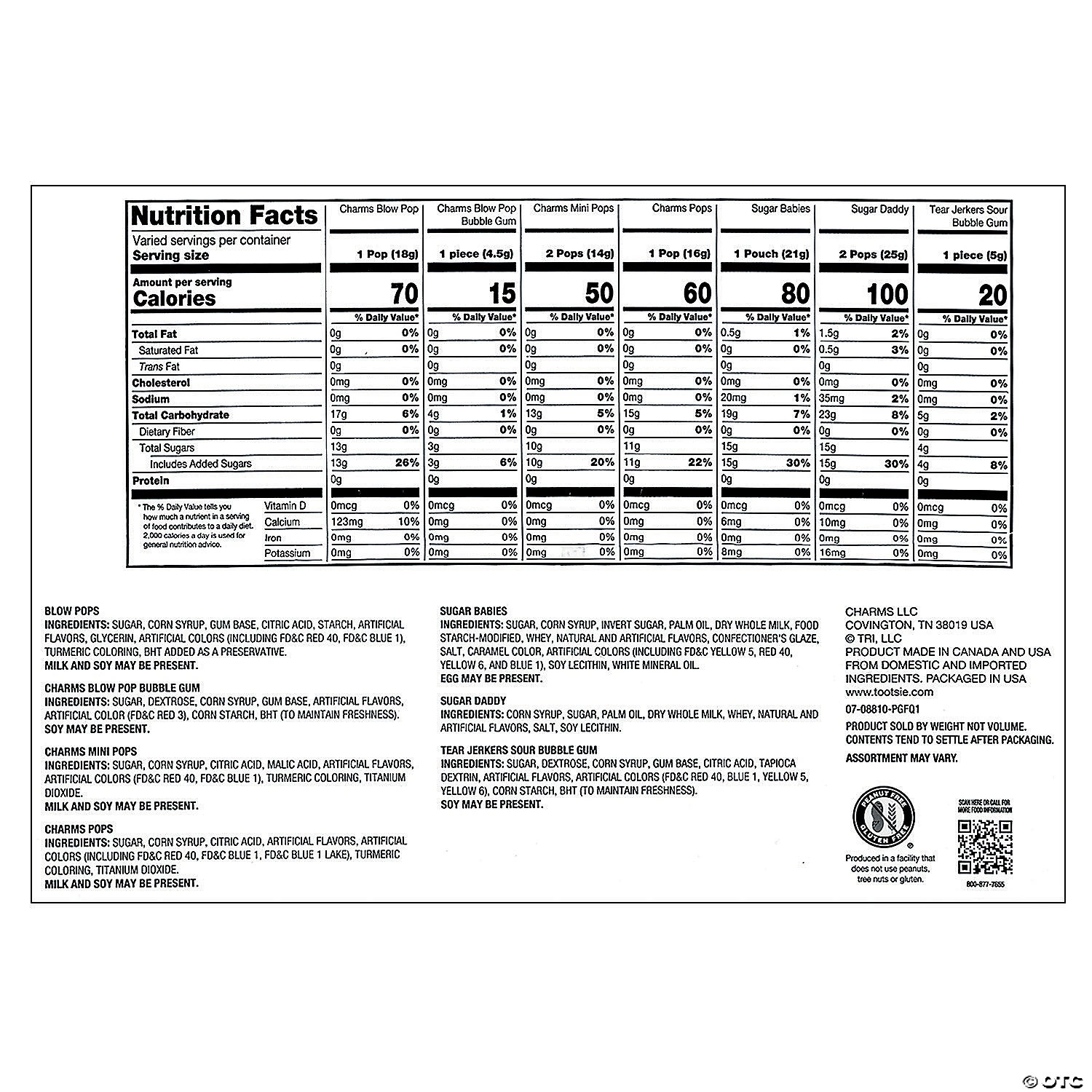 A fun candy mix to satisfy any sweet tooth! Perfect for a carnival, party, treat bags, Easter basket candy, Halloween candy for trick-or-treaters and more! With a wide variety of candy, you’ll get the best of both worlds from caramel favorites to more fruit-flavored candy picks.• Includes Blow Pops®, Sugar Babies®, Zip-A-Dee-Doo-Da Pops®, Sugar Daddy®, Charms® Sweet Pops®, Sugar Mama Caramels, Tear Jerkers® Sour Bubble Gum and Blow Pop® Bubble Gum. • (Approx. 100 pcs. per unit)• Total wt., 2 lbs. 12 oz. • Dairy-free• Gluten-free• Kosher• Nut-free• Candy is non-returnable. For more information, visit our “Return Policy” page located on our website.• Made in the USA. Important Country of Origin Information: For certain items sold by OTC on our Web or Mobile sites, country of origin information can change and what is displayed may not be accurate or consistent with manufacturer information. For up to date country of origin information, it is recommended that you rely on product packaging or other manufacturer information.• Ingredient, nutrition, allergen and other product information are provided on our Web and Mobile sites for reference purpose only, without warranty or representation as to accuracy. Manufacturers adjust their labeling regularly and are solely responsible for the accuracy of the information. For general questions concerning these items, please contact our customer service at 800-228-0475.