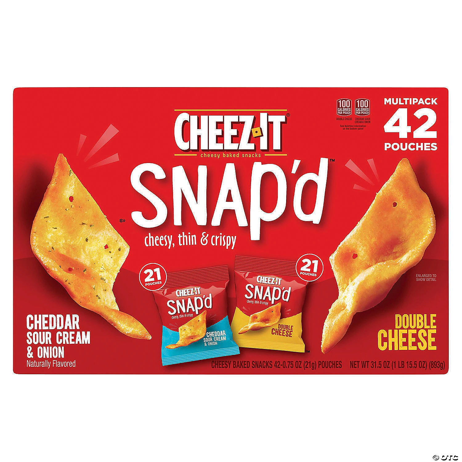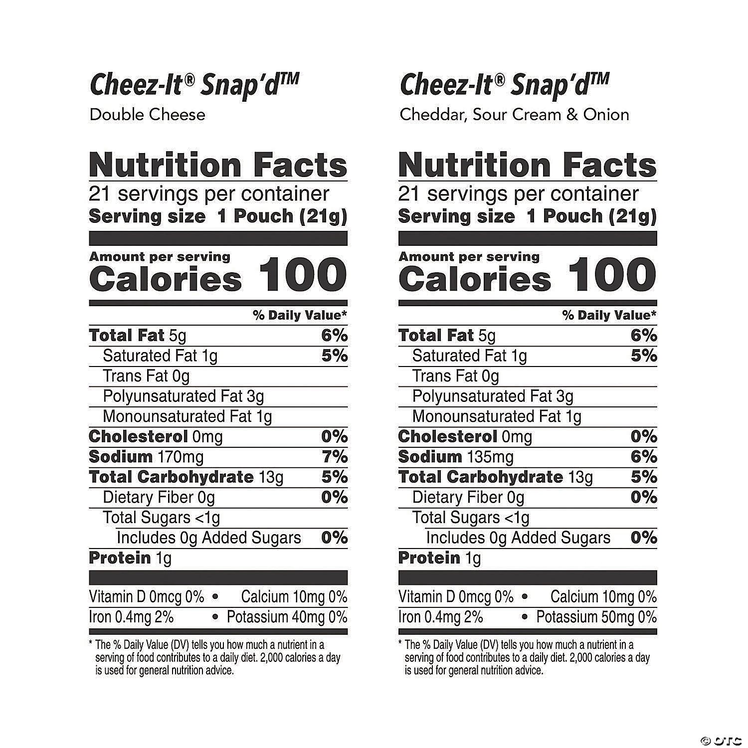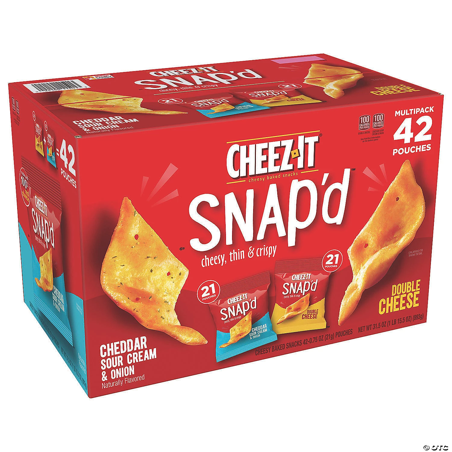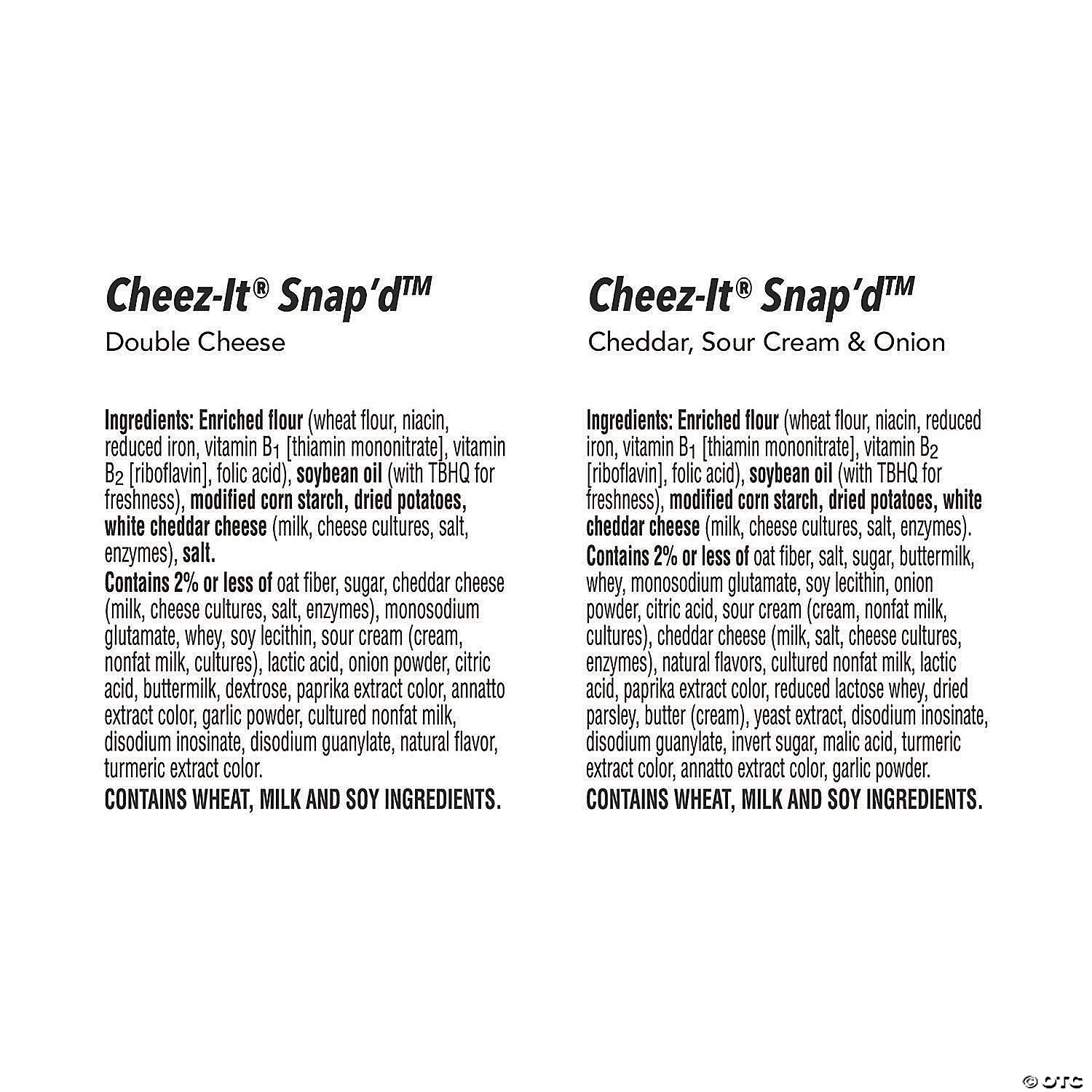 Make snack time more fun with Cheez-It Snapd Double Cheese the super thin and crispy cheesy baked snacks loaded with big cheese avor. With 100% real cheese baked-in and sprinkled on top, Cheez-It Snapd crackers are irresistibly cheesy. The Snap’d snacks are delightfully thin with a crispy snap for extra crunch in every bite. Cheez-It Snapd snacks are perfect for celebrating game time, make a great addition to party spreads, cure late-night savory cravings and morethe cheesy options are endless. Pack your Snapd snacks in school lunches or as an extra snack on-the-go. With double the cheesy zest for double the avor and double the fun, this snack will tempt you with, just one more bite. You’ll love the bold crunch and delicious, tasty avor of real cheese in every perfectly-baked bite of Cheez-It Snapd Double Cheese Cheesy Baked Snacks. Edibles are non-returnable. For more information, visit our “Return Policy” page located on our website.Special Shipping Information: This item ships separately from other items in your order. This item cannot ship to a P.O. Box. This item may be subject to additional processing days. ITEM IS NOT ELIGIBLE FOR EXPEDITED SHIPPING