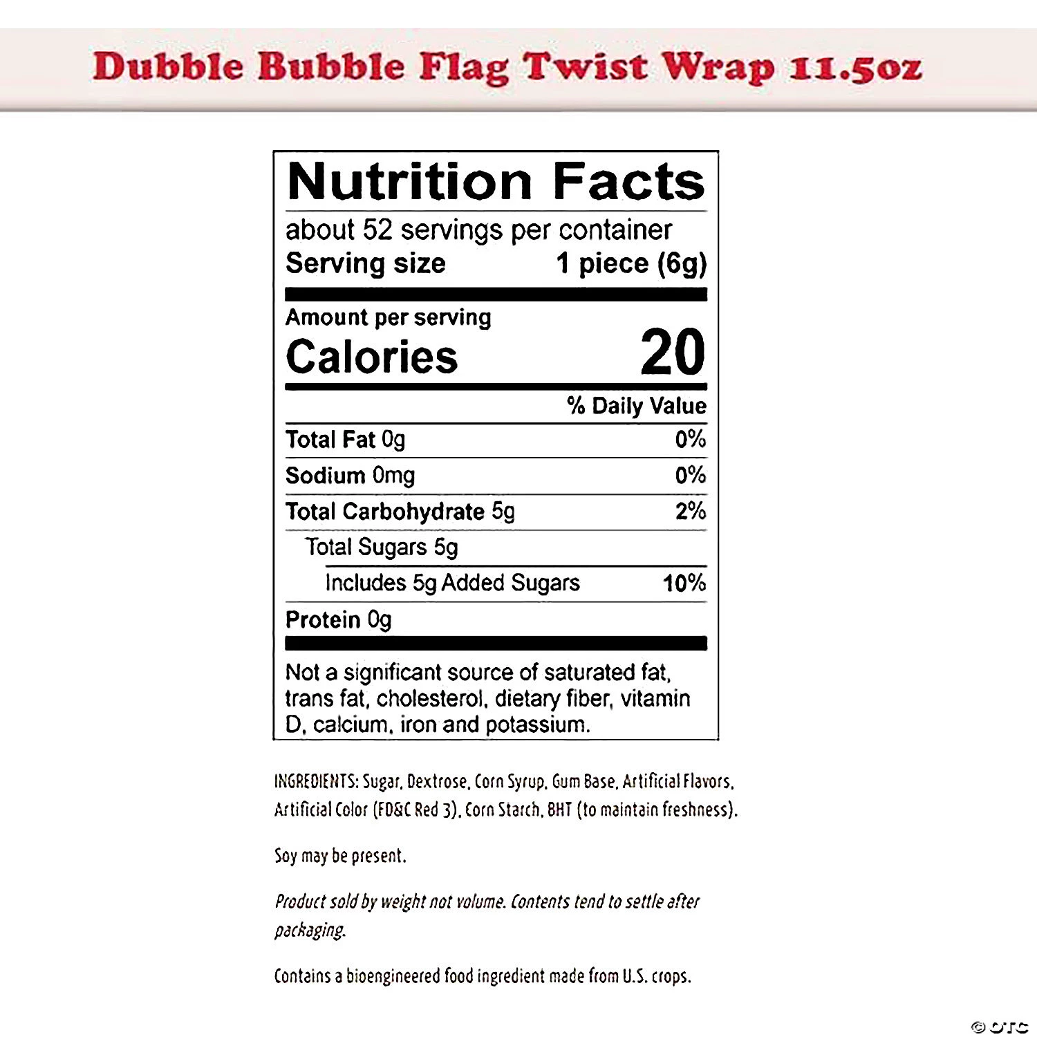 Give party guests or parade goers a patriotic treat during 4th of July with Dubble Bubble® American flag gum. Each piece of this 4th of July candy has a red, white and blue flag print wrapper. Individually wrapped. (24 pcs. per unit) Total wt., 11.5 oz.• Dairy-free. • Fat-free. • Gluten-free.• Kosher (Pareve). • Nut-free. • Total wt., 11.5 oz.• Candy is non-returnable. For more information, visit our “Return Policy” page located on our website.• Ingredient, nutrition, allergen and other product information are provided on our Web and Mobile sites for reference purpose only, without warranty or representation as to accuracy. Manufacturers adjust their labeling regularly and are solely responsible for the accuracy of the information. For general questions concerning these items, please contact our customer service at 800-228-0475.