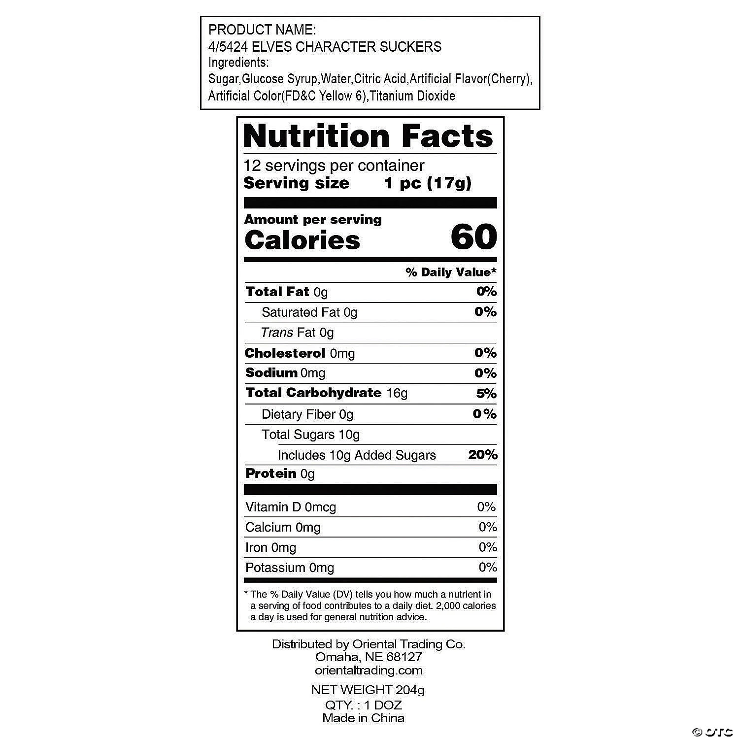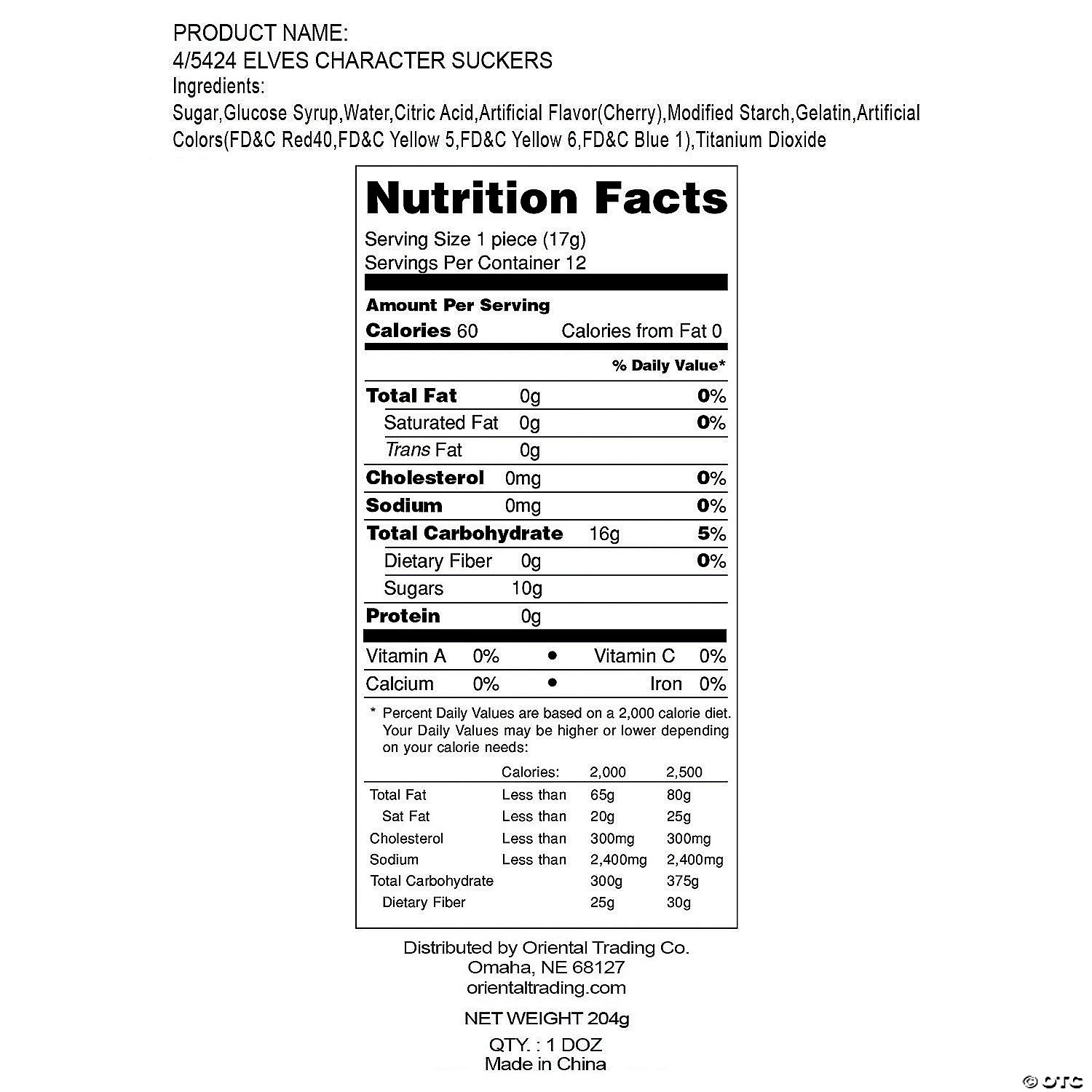 It’s time to fill up those Christmas treat bags and the Elves Character Suckers are just the right candy for the task! These adorable elves are perfect for Christmas gifts, pinatas and holiday grab bags. Also great for arranging and putting on the candy buffet for a festive touch. Hand these little helpers out to everyone who needs a dose of Christmas spirit. Includes a 2″ pop on a 4″ plastic stick. Cherry flavor. Individually wrapped. Fat-free. Total wt., 7 oz. © OTC• Candy is non-returnable. For more information, visit our “Return Policy” page located on our website.• Ingredient, nutrition, allergen and other product information are provided on our Web and Mobile sites for reference purpose only, without warranty or representation as to accuracy. Manufacturers adjust their labeling regularly and are solely responsible for the accuracy of the information. For general questions concerning these items, please contact our customer service at 800-228-0475.