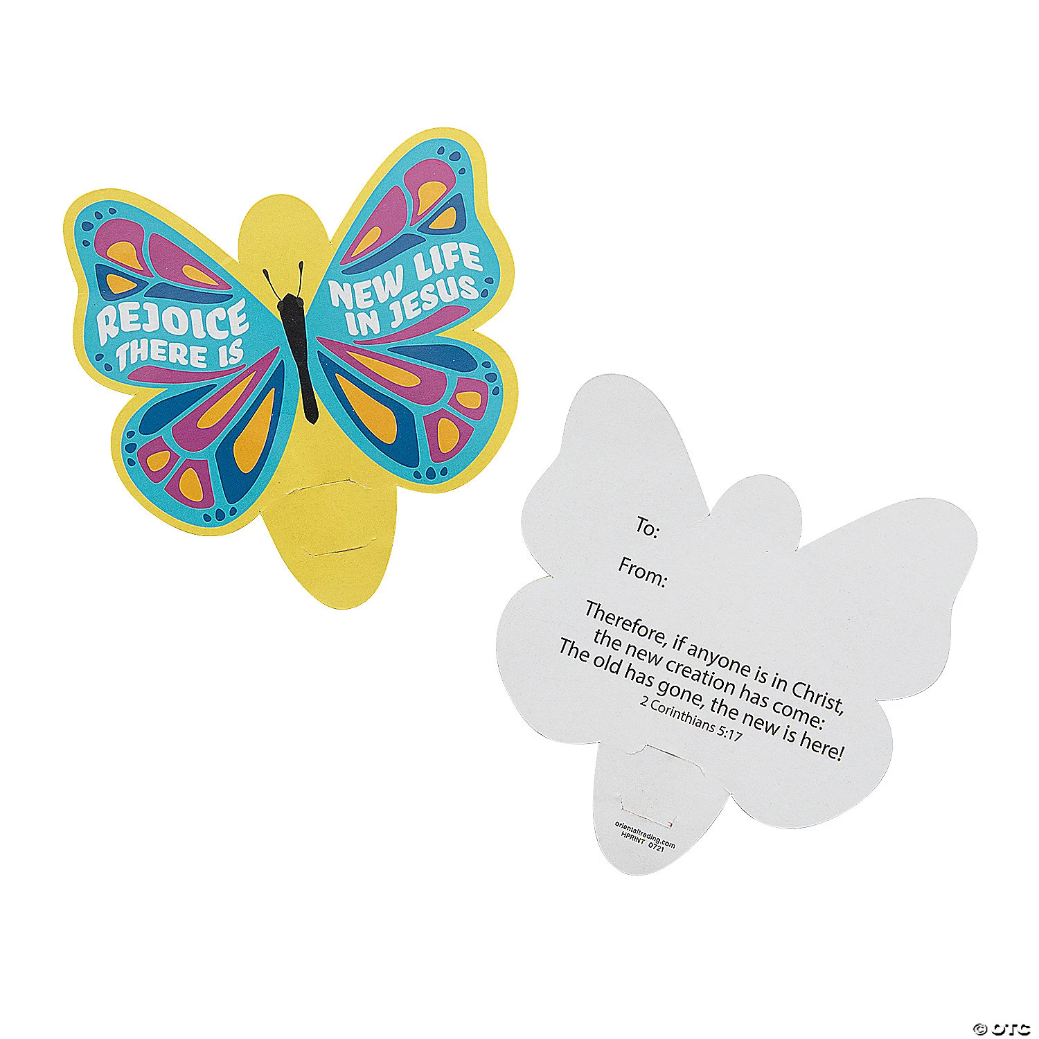 Are you looking for some cute Easter handouts for your Sunday School students? These butterfly cards with twisty lollipops will delight kids and help them remember to rejoice in the true meaning of Easter. Each colorful card is shaped like a butterfly and has faith messaging along with a To/From space for easy distribution. (48 pcs. per unit) Simple assembly required. Ā© OTC