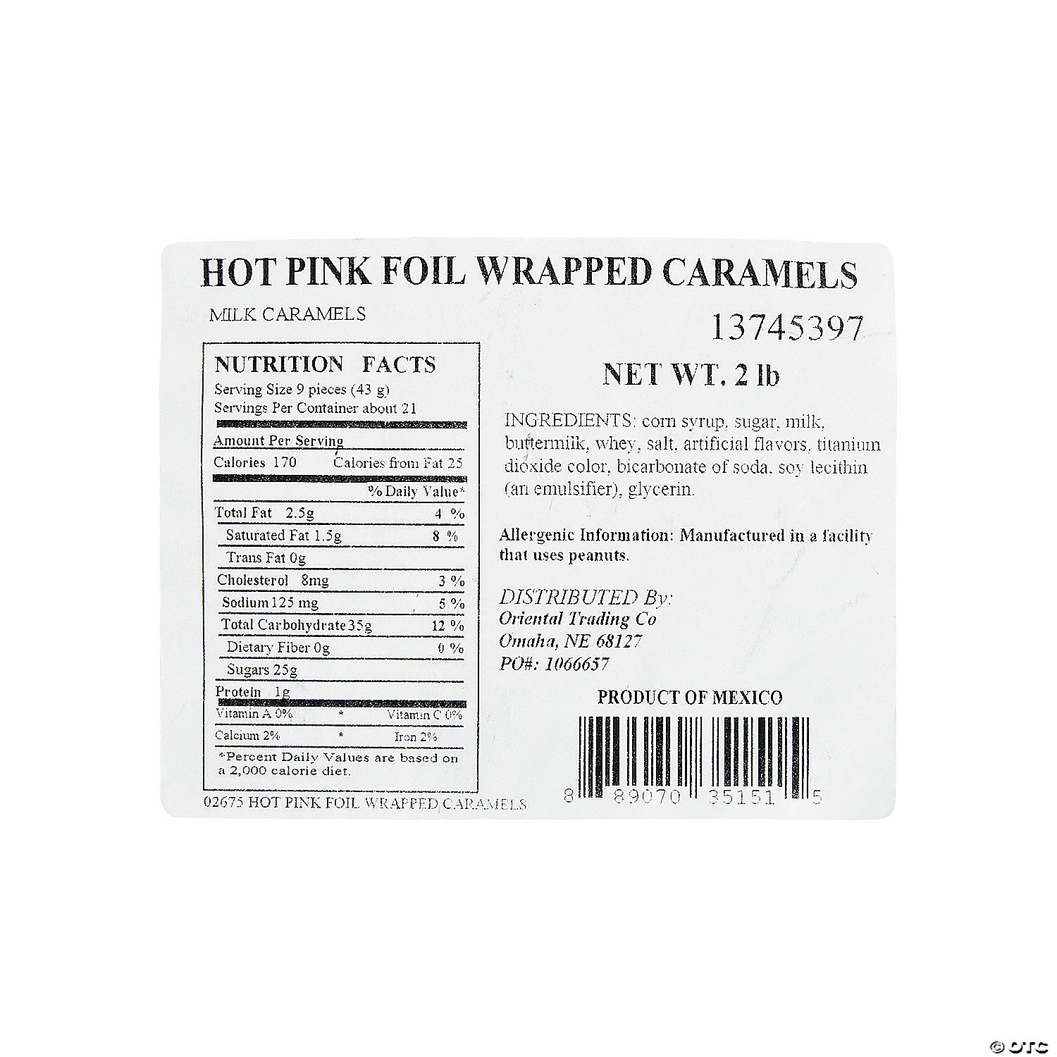 Are you looking for a sweet addition to your party supplies? Unwrap true happiness with these Foil-Wrapped Caramels. Perfect for any and every special celebration, these caramel treats will look absolutely fabulous in a candy buffet. Perfect for wedding receptions, birthday parties, holiday celebrations and so many more big occasions! Individually wrapped. (Approx. 189 pcs. per unit) Total wt., 2 lbs.• Candy is non-returnable. For more information, visit our “Return Policy” page located on our website.• Ingredient, nutrition, allergen and other product information are provided on our Web and Mobile sites for reference purpose only, without warranty or representation as to accuracy. Manufacturers adjust their labeling regularly and are solely responsible for the accuracy of the information. For general questions concerning these items, please contact our customer service at 800-228-0475.