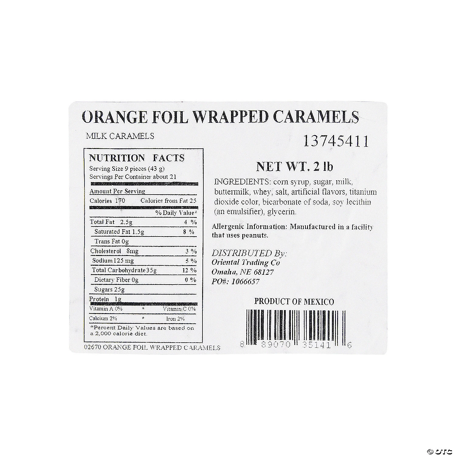Are you looking for a sweet addition to your party supplies? Unwrap true happiness with these Foil-Wrapped Caramels. Perfect for any and every special celebration, these caramel treats will look absolutely fabulous in a candy buffet. Perfect for wedding receptions, birthday parties, holiday celebrations and so many more big occasions! Individually wrapped. (Approx. 189 pcs. per unit) Total wt., 2 lbs.• Candy is non-returnable. For more information, visit our “Return Policy” page located on our website.• Ingredient, nutrition, allergen and other product information are provided on our Web and Mobile sites for reference purpose only, without warranty or representation as to accuracy. Manufacturers adjust their labeling regularly and are solely responsible for the accuracy of the information. For general questions concerning these items, please contact our customer service at 800-228-0475.