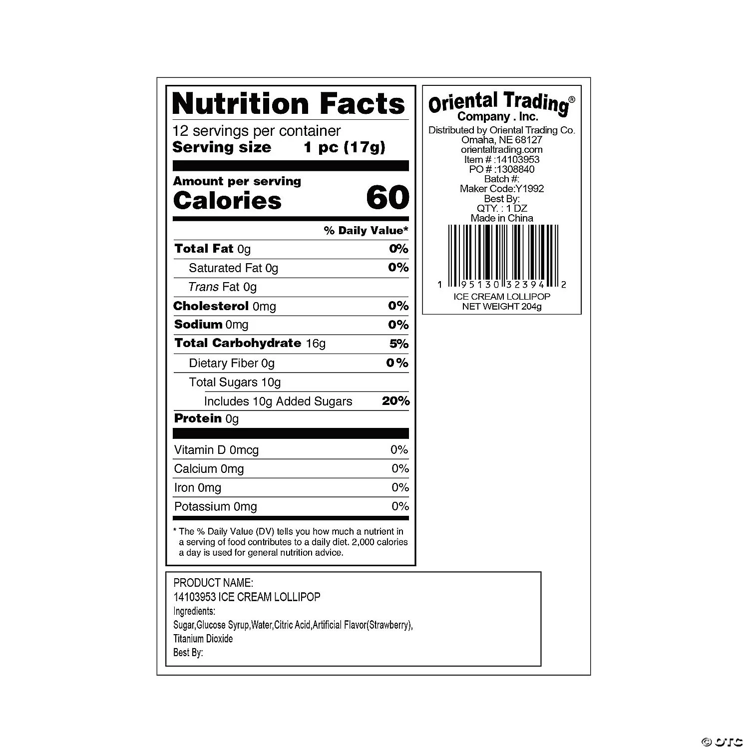 I scream, you scream, we all scream for…lollipops! Kids will love these tasty lollipops that come in an assortment of fun colors and are designed just like an ice cream cone. Hand them out as everyday treats or use them as birthday party favors, prizes and ice cream-themed event giveaways. Strawberry flavor. Individually wrapped. 1 1/4″ x 2 1/2″ pops on 4″ plastic sticks. Fat-free. Total wt., 7 oz. • Candy is non-returnable. For more information, visit our “Return Policy” page located on our website. • Ingredient, nutrition, allergen and other product information are provided on our Web and Mobile sites for reference purpose only, without warranty or representation as to accuracy. Manufacturers adjust their labeling regularly and are solely responsible for the accuracy of the information. For general questions concerning these items, please contact our customer service at 800-228-0475.