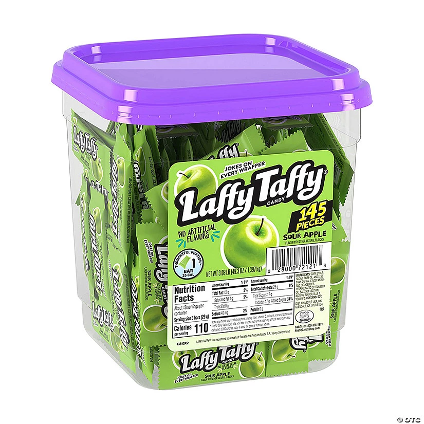 Sour apple is a favorite candy flavor among both kids and adults – and nothing packs quite a flavorful sour apple punch like Laffy Taffy! This tub of individually wrapped candies can help replenish a treat stash in the workplace, classroom or at home. Each candy wrapper features a silly joke and holds plenty of sour apple flavor. Sour apple flavor. (145 pcs./ per unit) Total wt., 49.3 oz.• Candy is non-returnable. For more information, visit our “Return Policy” page located on our website.• Ingredient, nutrition, allergen and other product information are provided on our Web and Mobile sites for reference purpose only, without warranty or representation as to accuracy. Manufacturers adjust their labeling regularly and are solely responsible for the accuracy of the information. For general questions concerning these items, please contact our customer service at 800-228-0475.