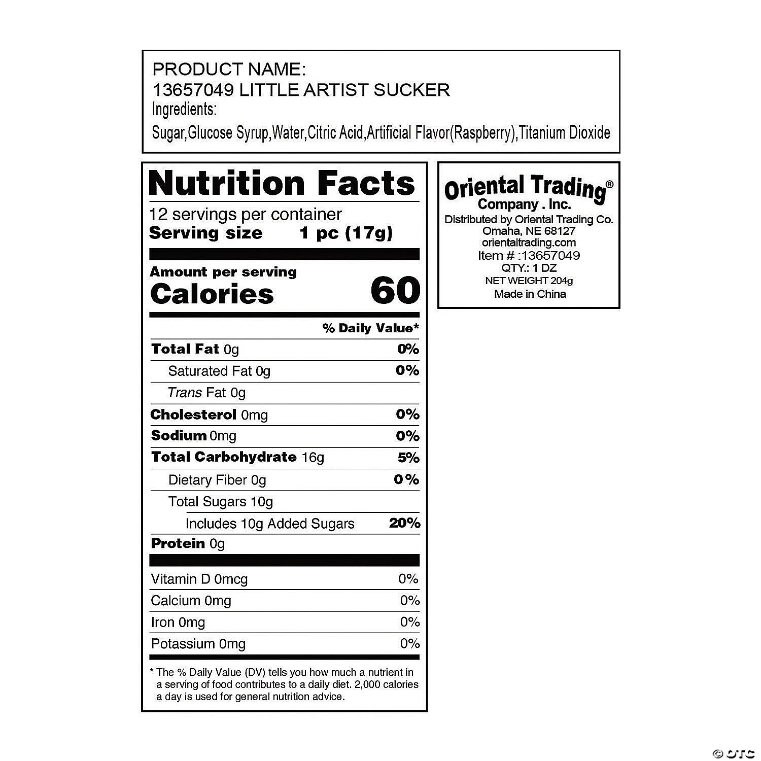 All the budding painters at your artist birthday party will love these suckers. Shaped like painter’s palettes, these pops are a delicious addition to birthday party supplies and goody bags. Create a creative DIY candy buffet and let all the little Monets serve themselves! © OTC• Raspberry flavored. • Individually wrapped.• Each 2″ sucker is on a 4″ paper stick. • Total wt., 7 oz. • Fat-free. • Candy is non-returnable. For more information, visit our “Return Policy” page located on our website.• Ingredient, nutrition, allergen and other product information are provided on our Web and Mobile sites for reference purpose only, without warranty or representation as to accuracy. Manufacturers adjust their labeling regularly and are solely responsible for the accuracy of the information. For general questions concerning these items, please contact our customer service at 800-228-0475.