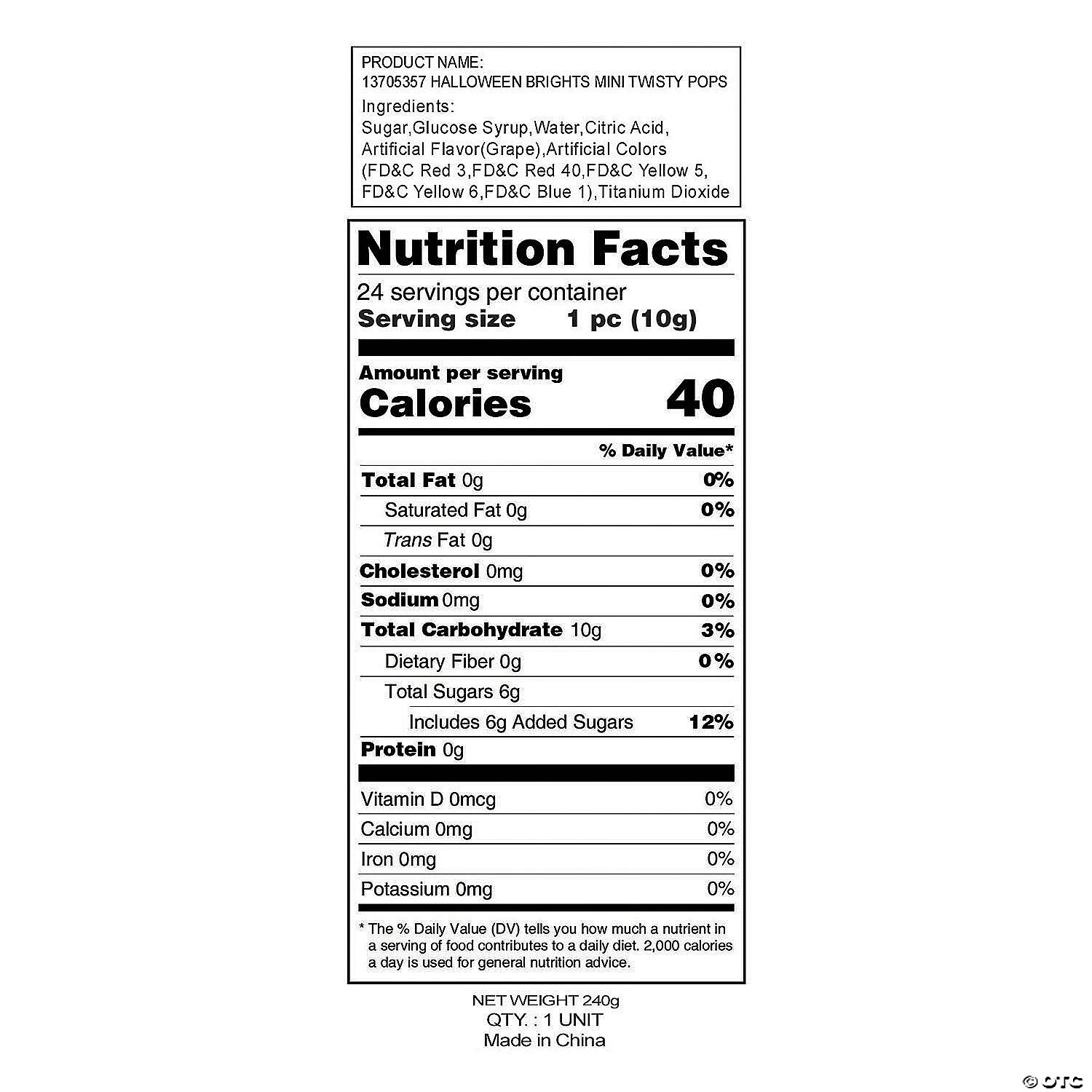 These suckers feature the classic Halloween colors: black, orange, purple and green, all on one pop! Great for Halloween giveaways or additions to your trick-or-treater’s Halloween candy, they taste just as good as they look! Each 2 1/2″ flavored pop is on a 4 1/2″ plastic stick. Individually wrapped. Grape flavor. (24 pcs. per unit) Fat-free. Total wt., 8 oz. Candy is non-returnable. For more information, visit our “Return Policy” page located on our website.