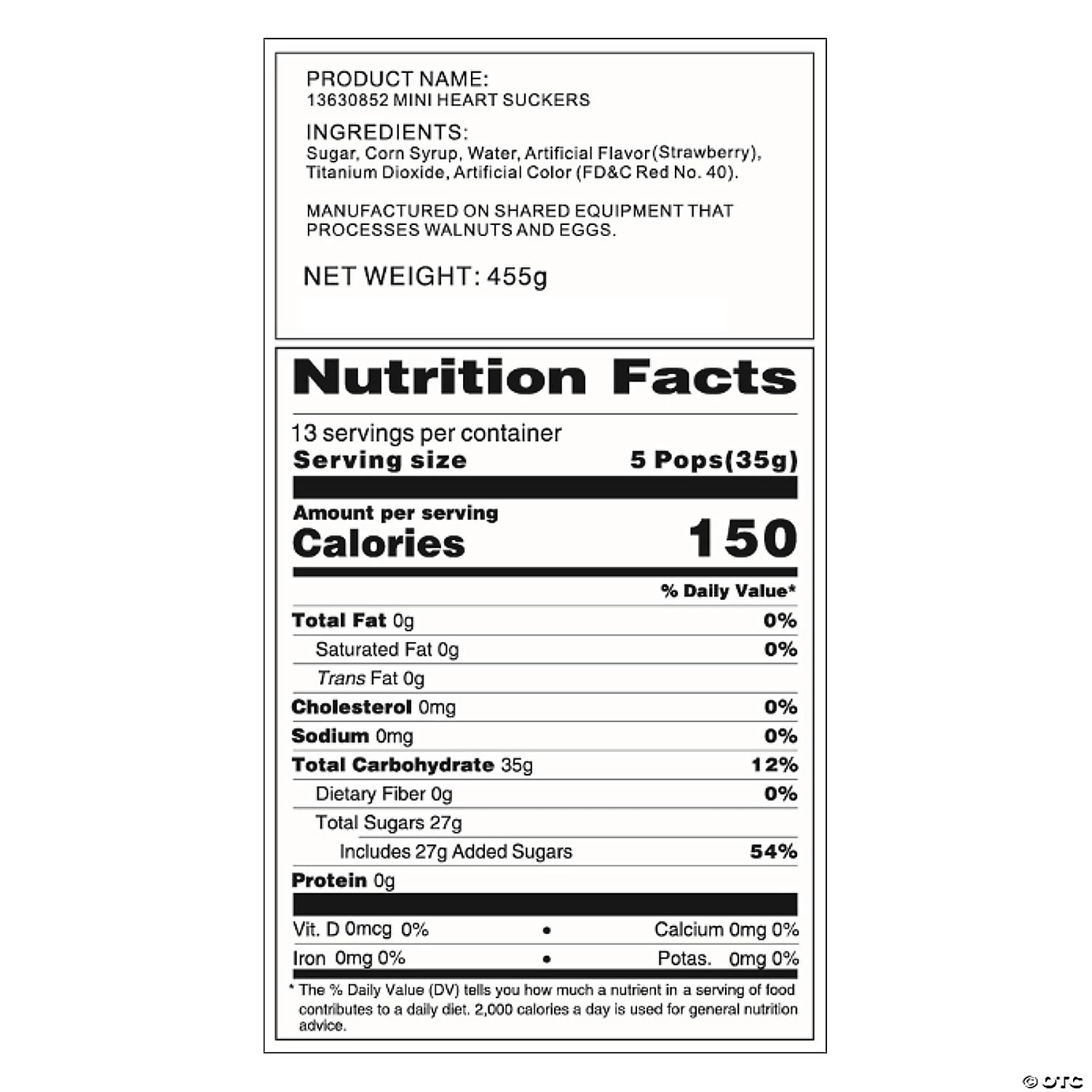 Drop these yummy Mini Heart Suckers in your Valentine candy goody bags or pass out during your Valentine’s Day activities. Tape to Valentine’s Day cards and notes for a sweet touch! Each 1 1/4″ strawberry-flavored sucker is on a 3″ stick. Individually wrapped. (Approx. 65 pcs. per unit) Total weight, 1 lb. Manufactured on shared equipment that processes walnuts and eggs. Candy is non-returnable. For more information, visit our “Return Policy” page located on our website. © OTC