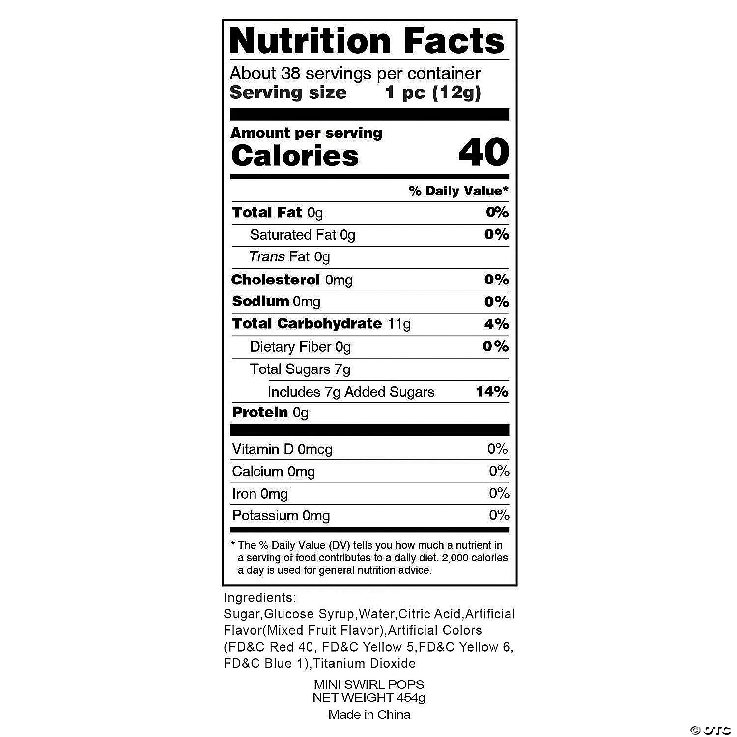 A rainbow of fun, these fruity Swirl Lollipops feature the nostalgic shape but in a fun mini shape! This sucker assortment make tasty treats for birthday party goody bags, Halloween and Trunk or Treat events! Mixed fruit flavor. Each lollipop is approximately 1 1/2″ on 3 3/4″ plastic stick. (Approx. 38 pcs. per unit) Individually wrapped. Fat-free. Total wt., 1 lb. Assortment may vary. • Candy is non-returnable. For more information, visit our “Return Policy” page located on our website.• Ingredient, nutrition, allergen and other product information are provided on our Web and Mobile sites for reference purpose only, without warranty or representation as to accuracy. Manufacturers adjust their labeling regularly and are solely responsible for the accuracy of the information. For general questions concerning these items, please contact our customer service at 800-228-0475.