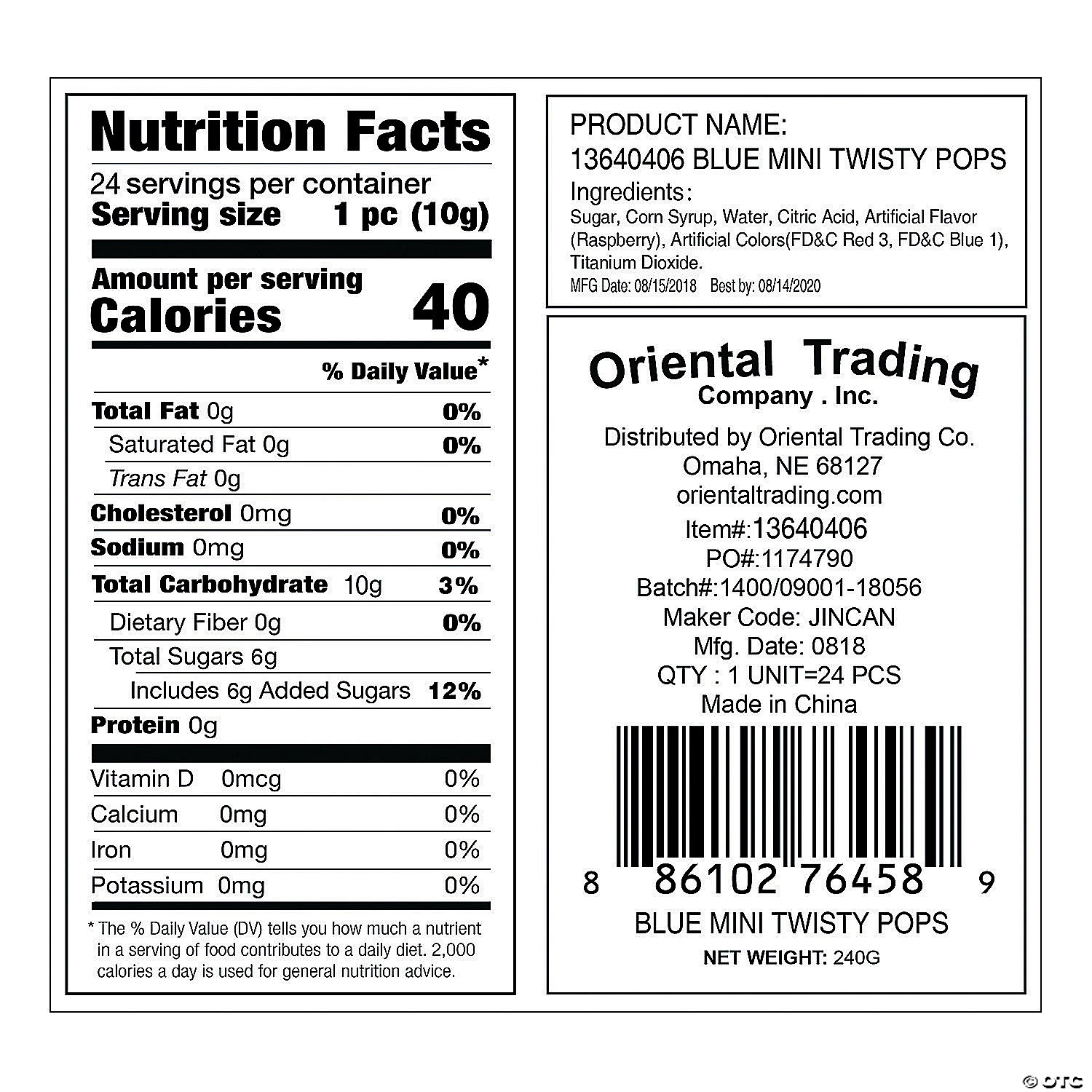 These Mini Twisty Pops make a fun and fashionable addition to your candy buffet! This popular candy can also be used to make wedding reception centerpieces and makes a great addition to party favor bags. Comes in a variety of colors and flavors to sweeten up any soirée! Each 2″ blue raspberry-flavored sucker is on a 4″ plastic stick. Individually wrapped. (24 pcs. per unit) Fat-free. Total wt., 9 oz. Candy is non-returnable. For more information, visit our “Return Policy” page located on our website.