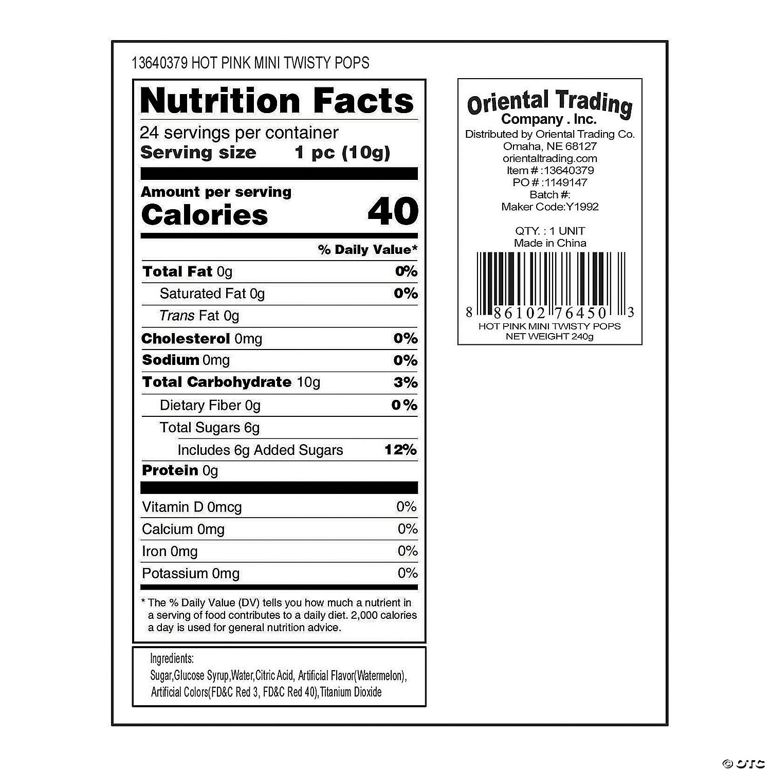 These Mini Twisty Pops make a fun and fashionable addition to your candy buffet! This popular candy can also be used to make wedding reception centerpieces and makes a great addition to party favor bags. Comes in a variety of colors and flavors to sweeten up any soirée! Each 2″ watermelon-flavored sucker is on a 4″ plastic stick. Individually wrapped. (24 pcs. per unit) Fat-free. Total wt., 9 oz. Candy is non-returnable. For more information, visit our “Return Policy” page located on our website.