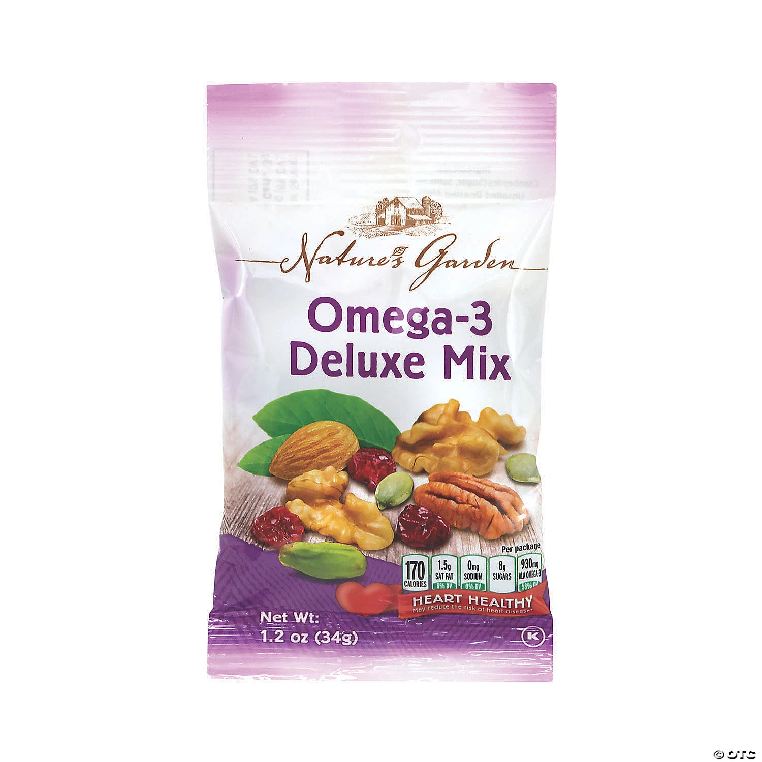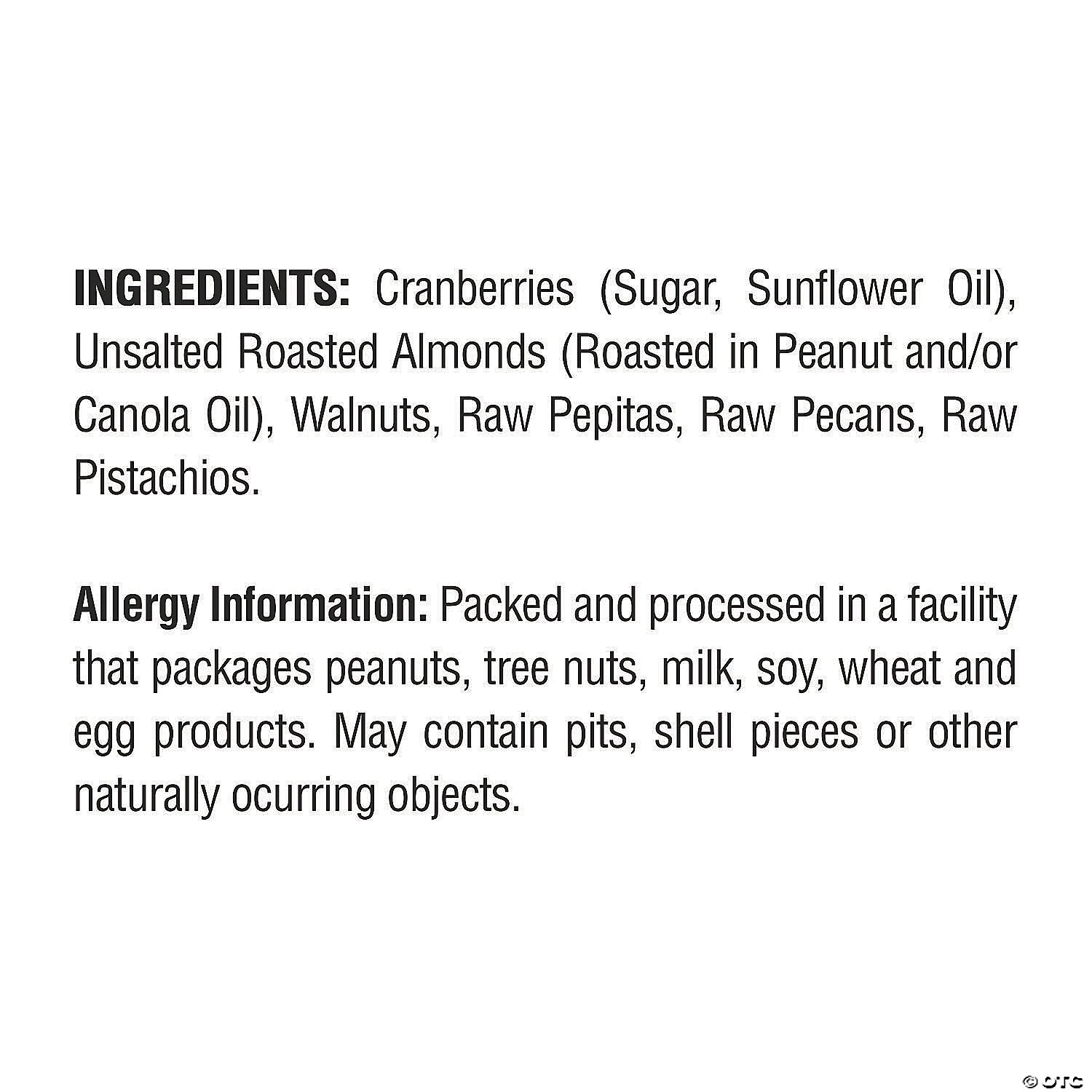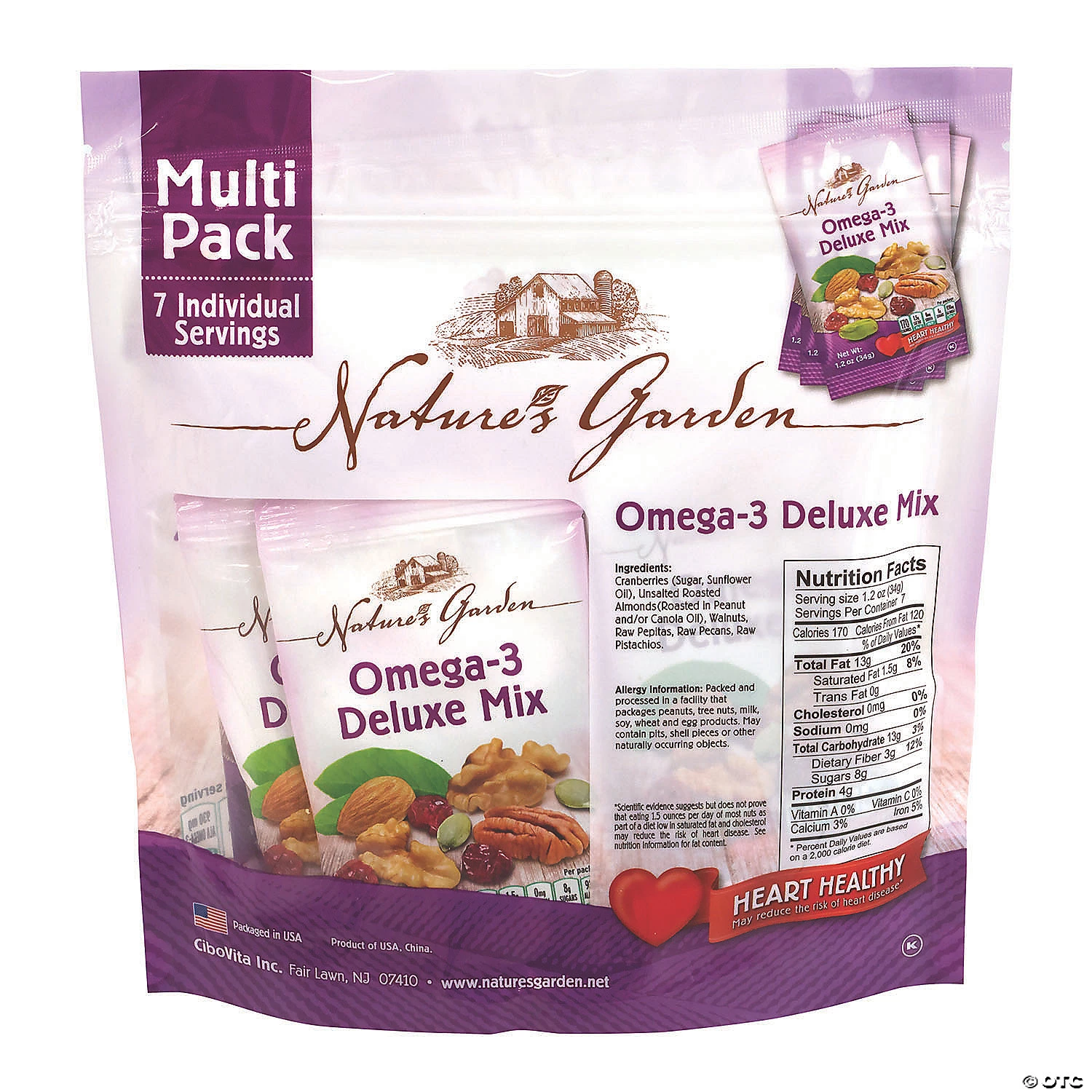 Snack healthy with this Nature’s Garden Omega-3 Deluxe mix of deliciously crunch natural nuts. Grab a handful of dried cranberries, walnuts, pepitas, almonds, pecans, and pistachios and enjoy a great tasking mix that is rich in omega-3 fatty acids. This heart-healthy mix is also an excellent source of protein, fiber and other vitamins. Nature’s Garden Omega-3 Deluxe mix is Cholesterol, Sodium and Gluten Free. With 6 7-Pouch bags, you’ll have plenty of nut mixes to enjoy! Edibles are non-returnable. For more information, visit our “Return Policy” page located on our website.Special Shipping Information: This item ships separately from other items in your order. This item cannot ship to a P.O. Box. This item may be subject to additional processing days. ITEM IS NOT ELIGIBLE FOR EXPEDITED SHIPPING