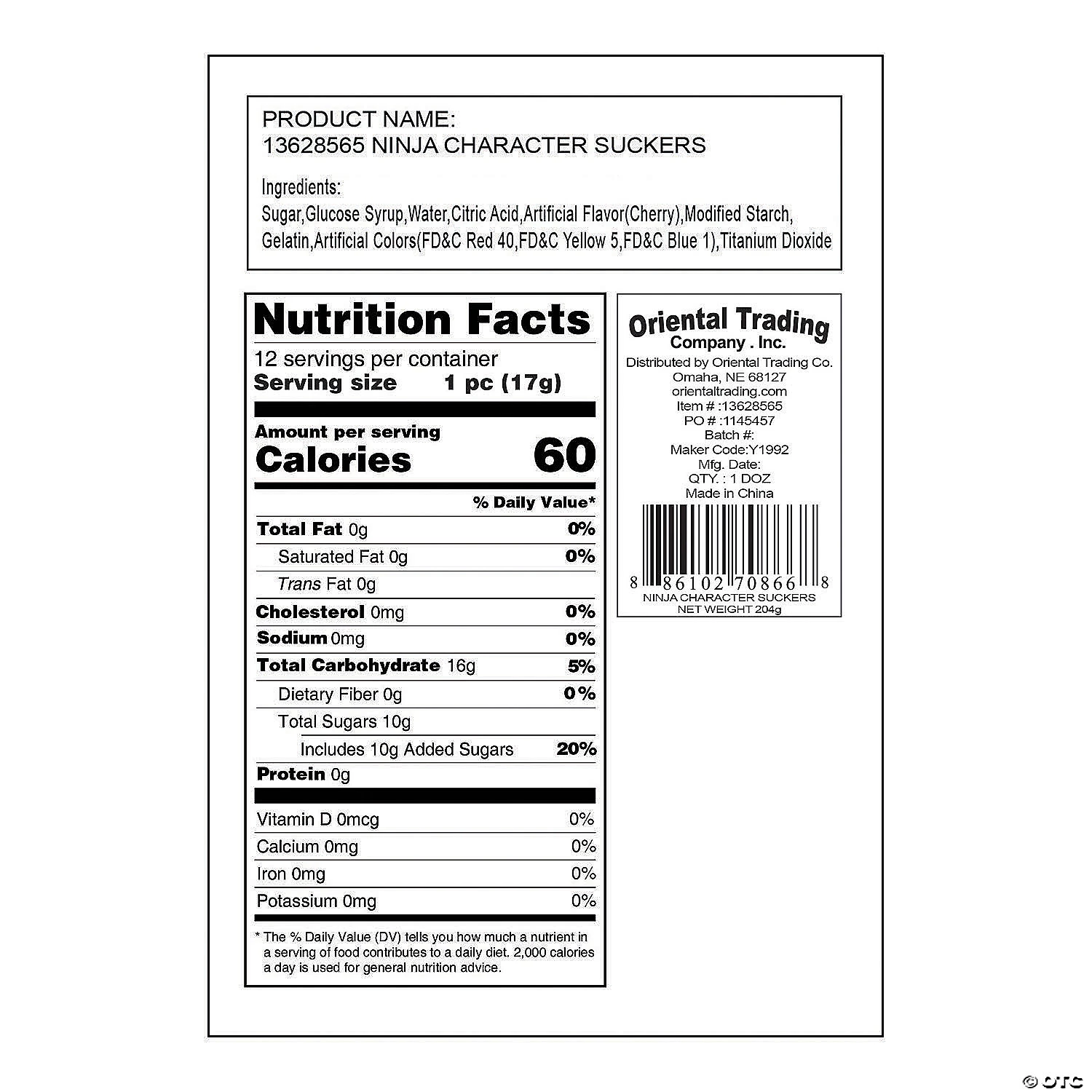 Slip these Ninja Character Suckers into party favor goody bags to kick things up! These cute little ninja suckers are great for birthday parties, karate and martial arts events and more. Each 1 3/4″ cherry-flavored sucker comes on a 4″ plastic stick. Each lollipop includes a printed wrapper. Individually wrapped. Fat-free. Total wt., 7 oz. Candy is non-returnable. For more information, visit our “Return Policy” page located on our website. © OTC