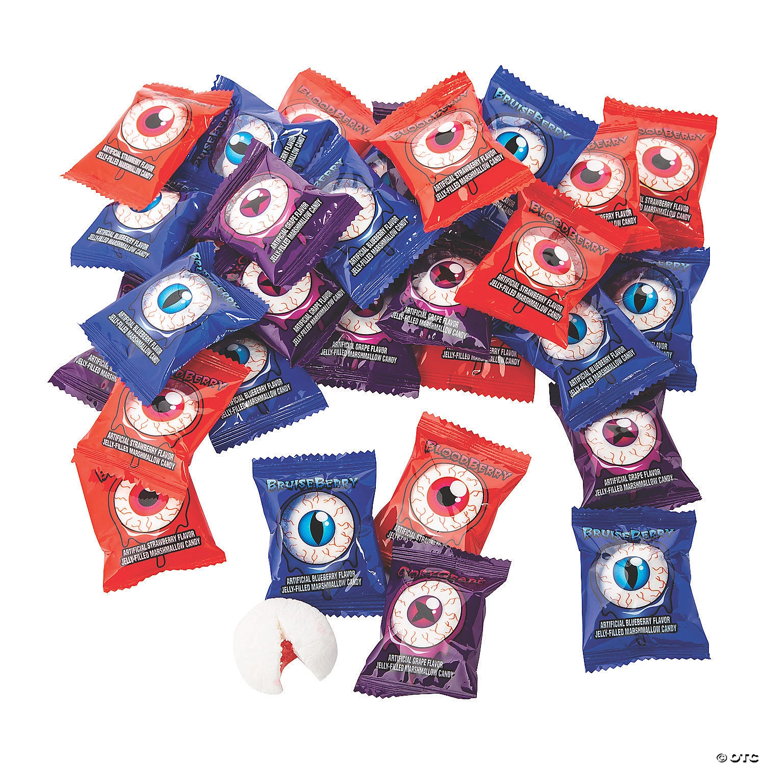 Keep your eye on this sweet candy! “Mad scientists”, optometrists and other trick-or-treaters love these gooey treats! These putrid peepers are macabre must-haves for Halloween trick-or-treaters and for trunk-or-treat giveaways. Marshmallow candy with assorted fruit-flavored jelly fillings. Individually wrapped. (36 pcs. per unit)• Dairy-free. • Nut-free. • Candy is non-returnable. For more information, visit our “Return Policy” page located on our website.• Ingredient, nutrition, allergen and other product information are provided on our Web and Mobile sites for reference purpose only, without warranty or representation as to accuracy. Manufacturers adjust their labeling regularly and are solely responsible for the accuracy of the information. For general questions concerning these items, please contact our customer service at 800-228-0475.