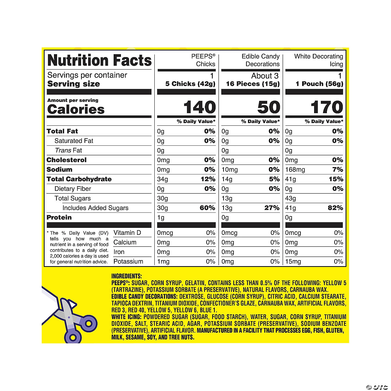 Decorate your marshmallows and eat them, too, with this fun Easter candy set! This candy decorating kit creates 5 unique peep chicks! It includes 5 marshmallow chicks, pre-mixed icing pouch and assorted edible candy decorations to make each chick your own… before you eat them! Great for Easter baskets. (5 chicks per kit) Box, 6 3/4″ x 1 1/2″ x 6 3/4″. Total wt., 5 oz.• Candy is non-returnable. For more information, visit our “Return Policy” page located on our website.• Made in the USA. Important Country of Origin Information: For certain items sold by OTC on our Web or Mobile sites, country of origin information can change and what is displayed may not be accurate or consistent with manufacturer information. For up to date country of origin information, it is recommended that you rely on product packaging or other manufacturer information.• Ingredient, nutrition, allergen and other product information are provided on our Web and Mobile sites for reference purpose only, without warranty or representation as to accuracy. Manufacturers adjust their labeling regularly and are solely responsible for the accuracy of the information. For general questions concerning these items, please contact our customer service at 800-228-0475.