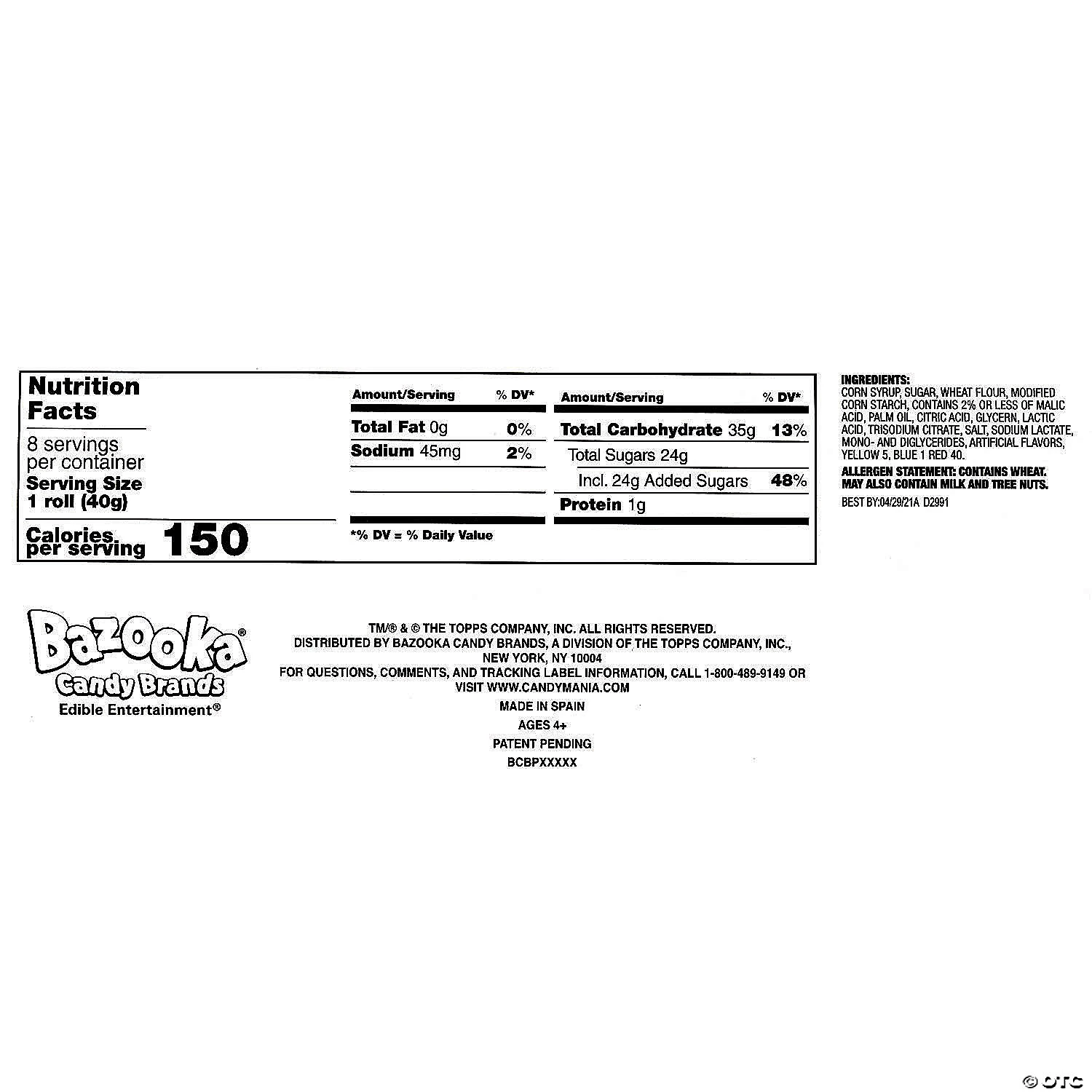 Unroll tons of fun with these candy rolls! This gummy candy is both fun and delicious, and it’s sure to go fast. Set up the display box so kids can see and pick their flavor or use the individual packs in your party favors. Individually wrapped. Display Box, 3″ x 10 1/2″ x 2 3/4″. (8 pcs. per unit) Total wt., 11.2 oz. ™/® & © The Topps Company, Inc.• Ingredient, nutrition, allergen and other product information are provided on our Web and Mobile sites for reference purpose only, without warranty or representation as to accuracy. Manufacturers adjust their labeling regularly and are solely responsible for the accuracy of the information. For general questions concerning these items, please contact our customer service at 800-228-0475.
