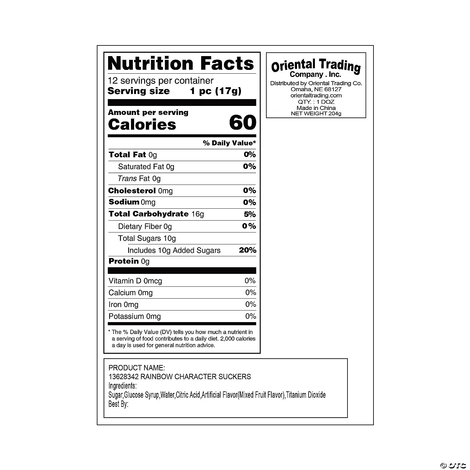 Somewhere over the rainbow there are delicious lollipops for everyone! Throwing a rainbow theme birthday party? Use these colorful suckers in your goody bags or leave them on tables to double as decorations! © OTC• Cherry flavored.• Individually wrapped. • Includes 2″ suckers on 4″ plastic sticks.• Total wt., 7 oz. • Assortment may vary. • Fat-free. • Candy is non-returnable. For more information, visit our “Return Policy” page located on our website. • Ingredient, nutrition, allergen and other product information are provided on our Web and Mobile sites for reference purpose only, without warranty or representation as to accuracy. Manufacturers adjust their labeling regularly and are solely responsible for the accuracy of the information. For general questions concerning these items, please contact our customer service at 800-228-0475.