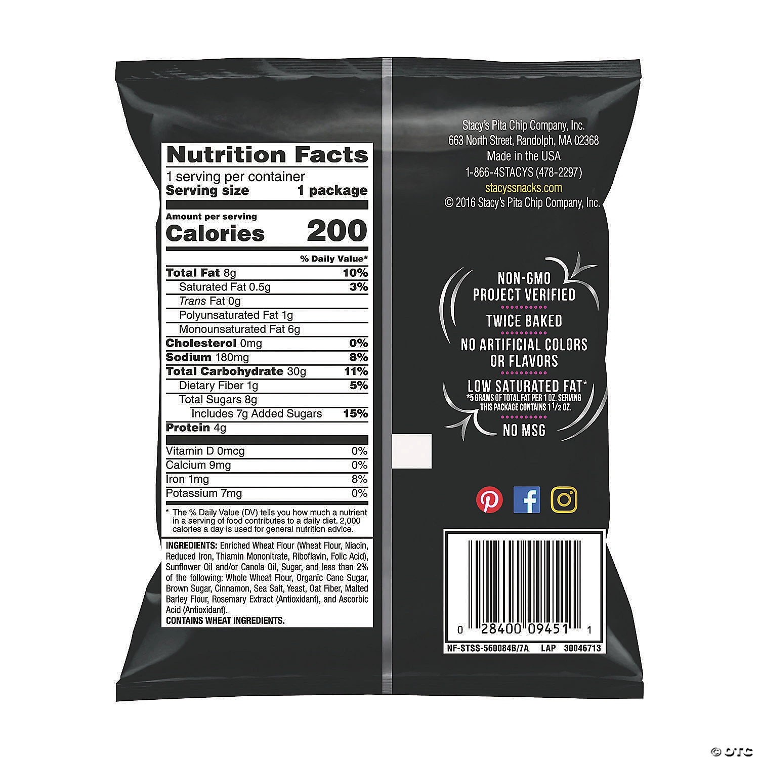 Two of the most delicious flavors on Earth – pure cinnamon and milled cane sugar – meet the delicious crunch of STACY’S Pita Chips. Stacy’s Pita Chips Cinnamon Sugar, 1.5 oz., 24 Count are Non-GMO, and have no artificial color or flavor. These pita chips are great for snacking on if you’re on-the-go or just lounging in front of the TV. Bite into the crisp crunch of real pita bread with Stacy’s Pita Chips Cinnamon and Sugar. Edibles are non-returnable. For more information, visit our “Return Policy” page located on our website.Special Shipping Information: This item ships separately from other items in your order. This item cannot ship to a P.O. Box. This item may be subject to additional processing days. ITEM IS NOT ELIGIBLE FOR EXPEDITED SHIPPING