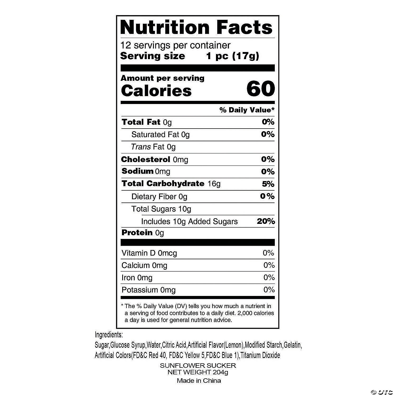 Let everyone enjoy a taste of summer by handing out these glorious Sunflower Suckers. A fun addition to tea parties, garden parties and other summer events, these lemon-flavored suckers are sure to be a hit. These make a sweet addition to gift bags and table settings! Includes 1 3/4″ pops on 4″ plastic sticks. Individually wrapped. Fat-free. Total wt., 7 oz. © OTC• Candy is non-returnable. For more information, visit our “Return Policy” page located on our website. • Ingredient, nutrition, allergen and other product information are provided on our Web and Mobile sites for reference purpose only, without warranty or representation as to accuracy. Manufacturers adjust their labeling regularly and are solely responsible for the accuracy of the information. For general questions concerning these items, please contact our customer service at 800-228-0475.