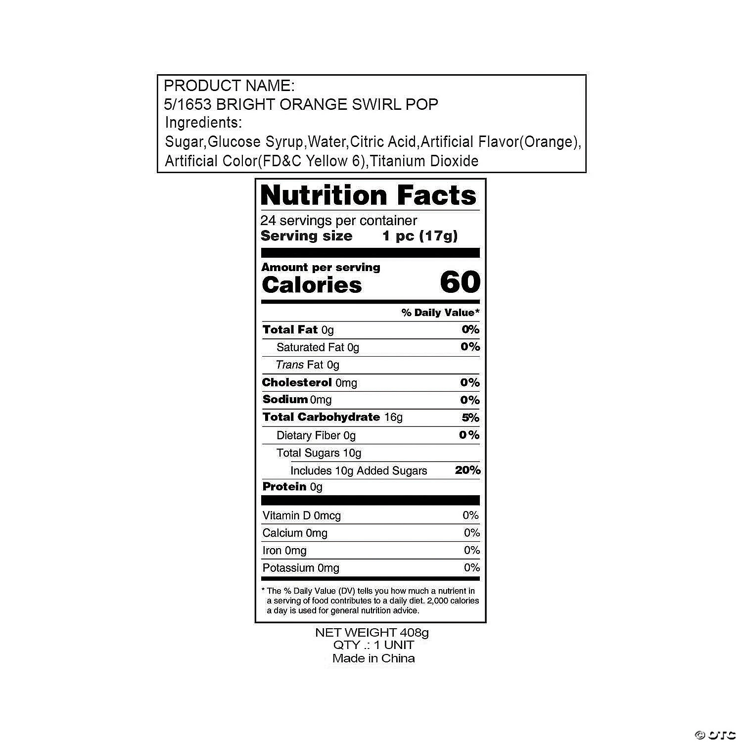 These suckers are a great treat to have around during wedding receptions, birthday parties, carnivals, fundraisers or wherever you need to brighten up your treat table or candy buffet! Sweet, tasty fun for both kids and adults! Orange flavor. Individually wrapped. Each 2″ pop is on a 4 1/2″ plastic stick. (2 dozen per unit) Total wt., 14 oz. Fat-free. Gluten-free. © OTC• Candy is non-returnable. For more information, visit our “Return Policy” page located on our website.• Ingredient, nutrition, allergen and other product information are provided on our Web and Mobile sites for reference purpose only, without warranty or representation as to accuracy. Manufacturers adjust their labeling regularly and are solely responsible for the accuracy of the information. For general questions concerning these items, please contact our customer service at 800-228-0475.