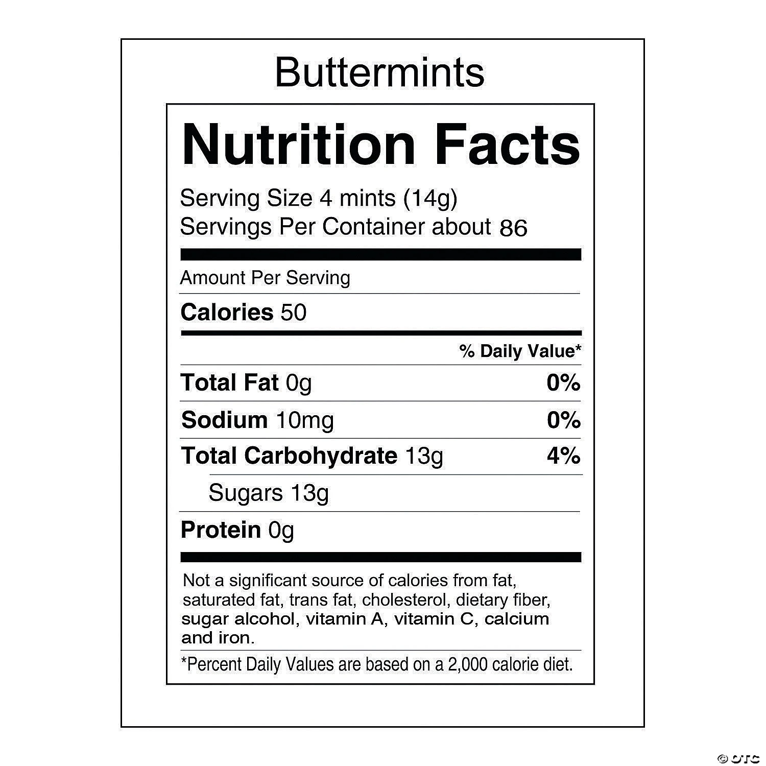 A sweet touch for your wedding candy buffet, these unwrapped buttermints are a wedding reception classic. They’re just the thing to clear the palate after the feast and before the dessert is brought out. These small mint-flavored treats have a subtle and smooth flavor that everyone loves. (Approx. 344 pcs. per unit) Total wt., 2 lbs 12 oz.• Fat-free.• Gluten-free.• Kosher.• Nut-free.• Candy is non-returnable. For more information, visit our “Return Policy” page located on our website.• Made in the USA. Important Country of Origin Information: For certain items sold by OTC on our Web or Mobile sites, country of origin information can change and what is displayed may not be accurate or consistent with manufacturer information. For up to date country of origin information, it is recommended that you rely on product packaging or other manufacturer information.• Ingredient, nutrition, allergen and other product information are provided on our Web and Mobile sites for reference purpose only, without warranty or representation as to accuracy. Manufacturers adjust their labeling regularly and are solely responsible for the accuracy of the information. For general questions concerning these items, please contact our customer service at 800-228-0475.