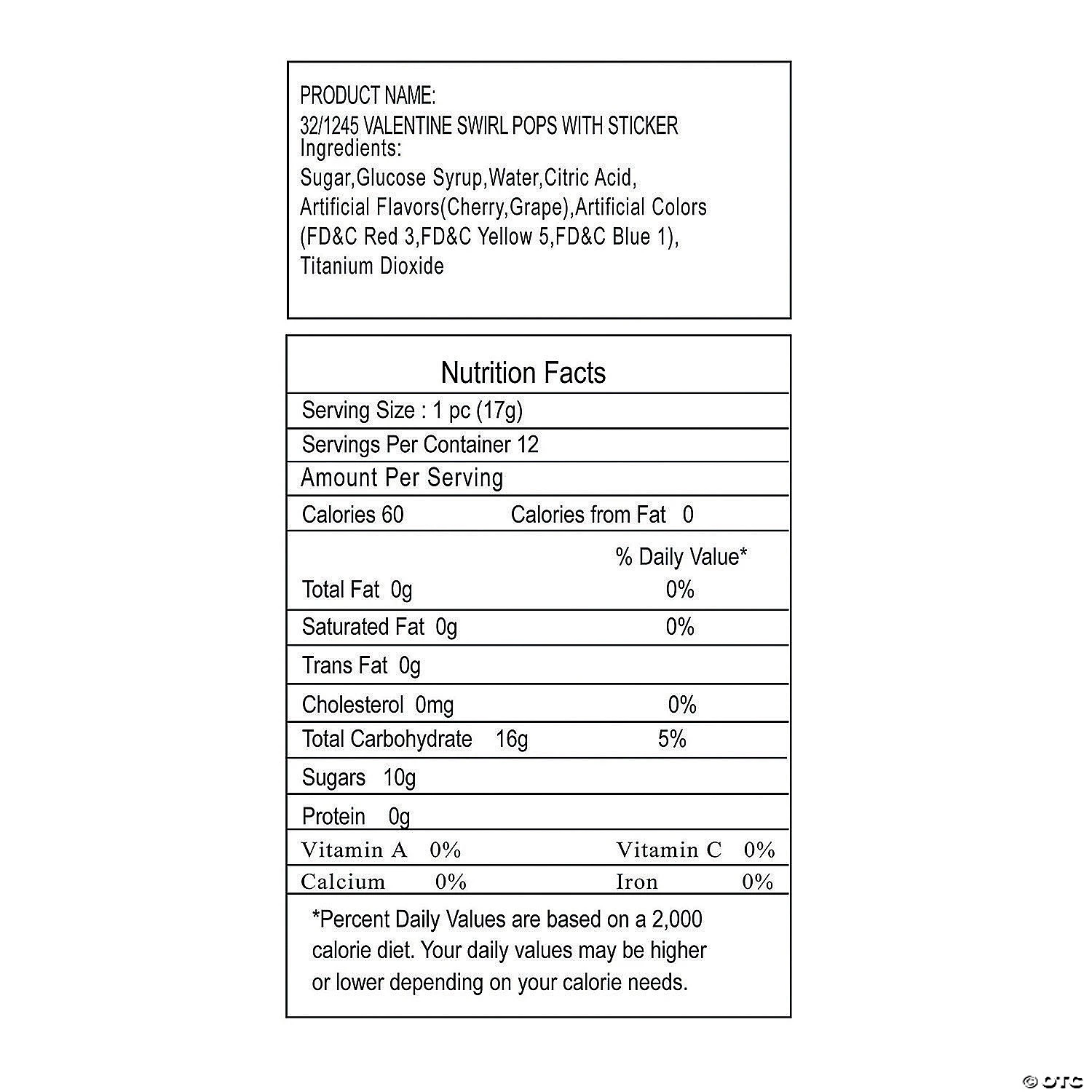 Give your Valentine’s Day a little “pop” with these assorted cherry and grape-flavored suckers. Create your own Valentine’s Day bouquet of sweetness by adding a couple of these fat-free treats to any valentine candy assortment. Each individually wrapped 2″ swirly sucker comes on a 5″ plastic stick and includes a removable sticker with a fun Valentine’s Day message. Total weight, 7 oz. Gluten-free. Fat-free. Candy is non-returnable. For more information, visit our “Return Policy” page located on our website. © OTC