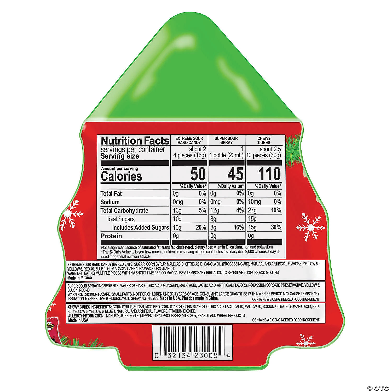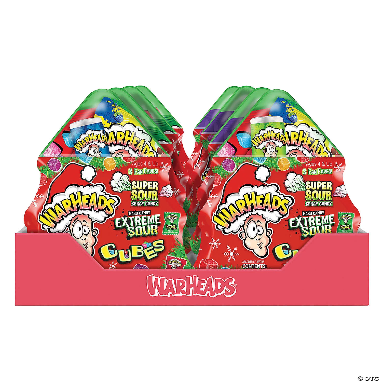 ‘Tis the season for some yummy, sour fun! These Warheads tree-shaped packs are full of Warhead favorites like hard candy, chewy cubes and candy spray. The ultimate stocking stuffer or holiday party prize for kids, these festive candy packs bring the sour (and the “extreme” sour!) for an unusual holiday treat. Assorted fruit flavors. Individually wrapped. (8 pcs. per unit) Fat-free. Total wt., 8 oz.• Candy is non-returnable. For more information, visit our “Return Policy” page located on our website.• Made in the USA. Important Country of Origin Information: For certain items sold by OTC on our Web or Mobile sites, country of origin information can change and what is displayed may not be accurate or consistent with manufacturer information. For up to date country of origin information, it is recommended that you rely on product packaging or other manufacturer information.• Ingredient, nutrition, allergen and other product information are provided on our Web and Mobile sites for reference purpose only, without warranty or representation as to accuracy. Manufacturers adjust their labeling regularly and are solely responsible for the accuracy of the information. For general questions concerning these items, please contact our customer service at 800-228-0475.