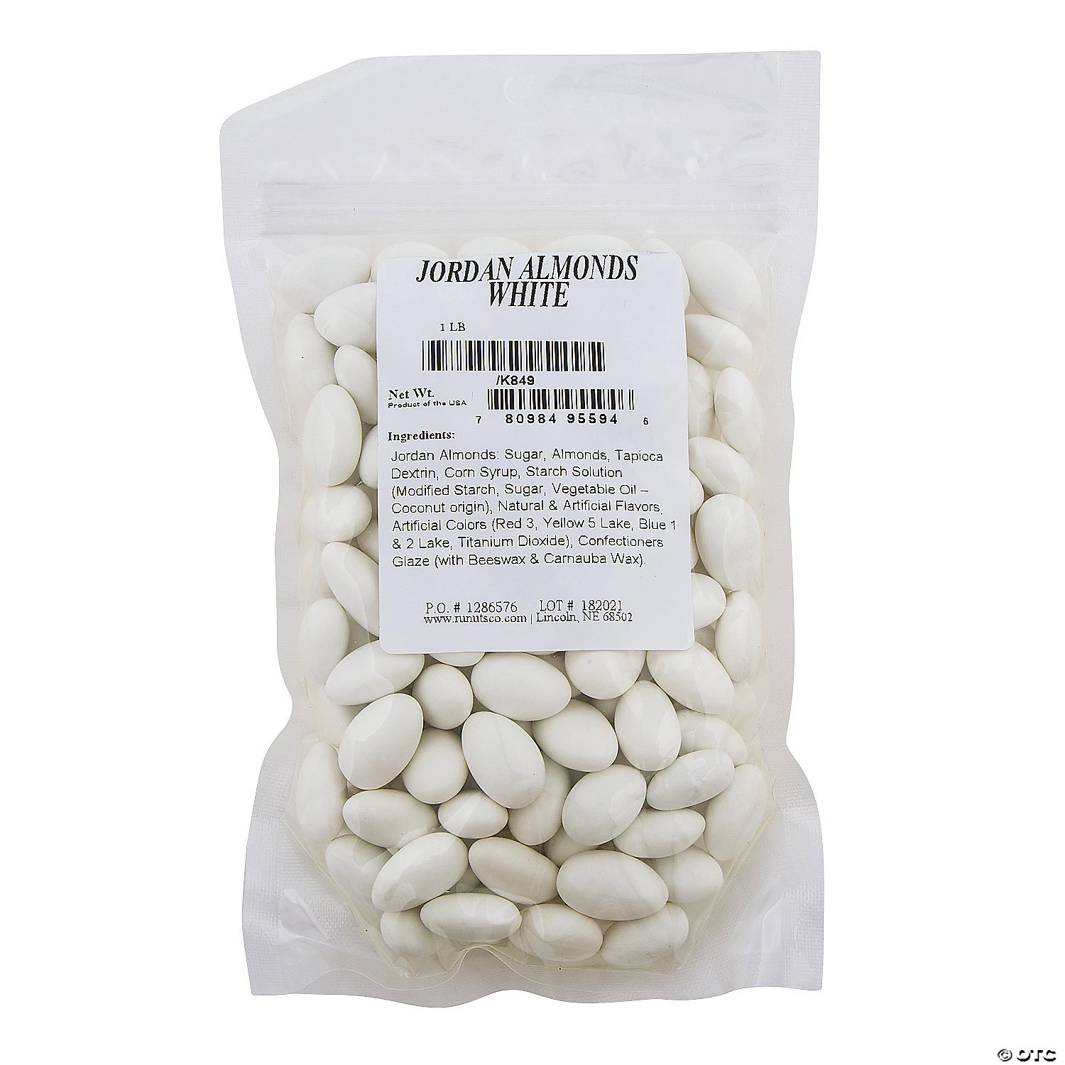 Nuts are favorite party treats for birthdays, weddings, anniversaries and more. A tasty addition to your party supplies, these White Jordan Almonds are encased in a hard white candy coating and will look great in your candy buffet. Drop them in your goody bags for guests to take home as party favors from your special day, or dump them in bowls and set them out on all of your party tables for easy access. (Approx. 119 pcs. per unit) Total wt., 1 lb.• Dairy-free• Candy is non-returnable. For more information, visit our “Return Policy” page located on our website.• Made in the USA, Important Country of Origin Information: For certain items sold by OTC on our Web or Mobile sites, country of origin information can change and what is displayed may not be accurate or consistent with manufacturer information. For up to date country of origin information, it is recommended that you rely on product packaging or other manufacturer information.• Ingredient, nutrition, allergen and other product information are provided on our Web and Mobile sites for reference purpose only, without warranty or representation as to accuracy. Manufacturers adjust their labeling regularly and are solely responsible for the accuracy of the information. For general questions concerning these items, please contact our customer service at 800-228-0475.